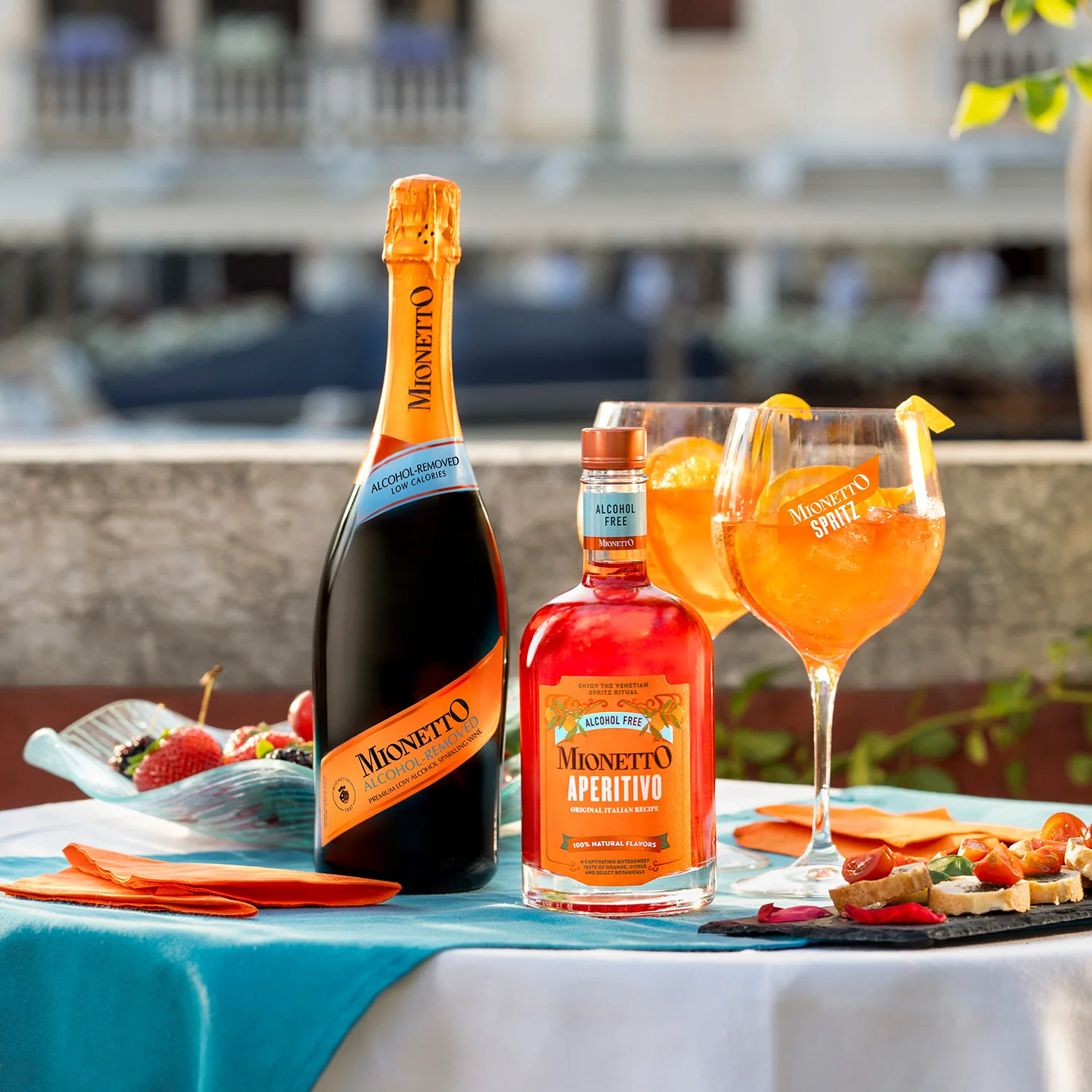 Naplňte sklenici ledem, přidejte Mionetto 0,0 % a Mionetto Aperitivo nealkoholické. Lehce promíchejte a ozdobte plátkem pomeranče.